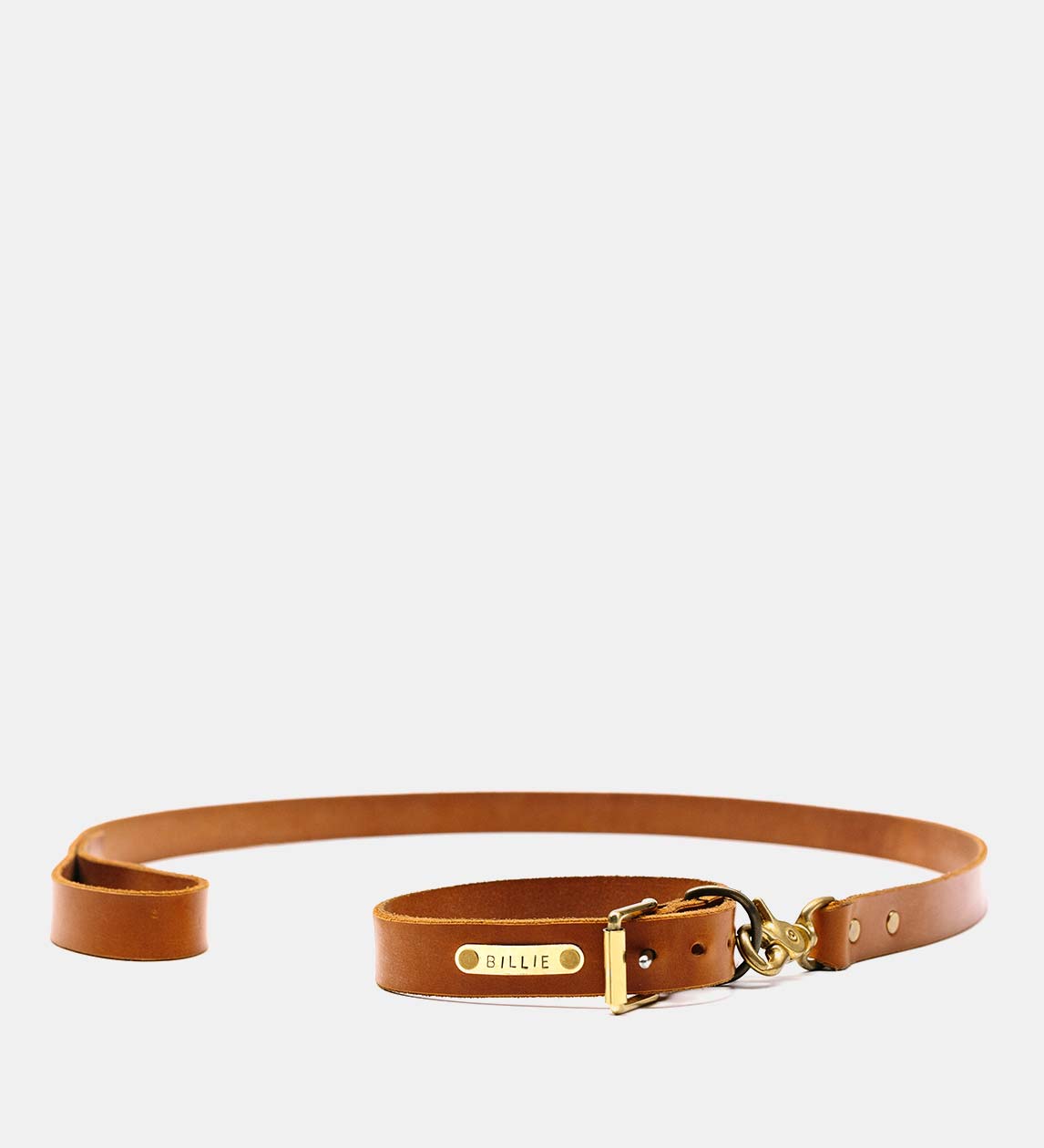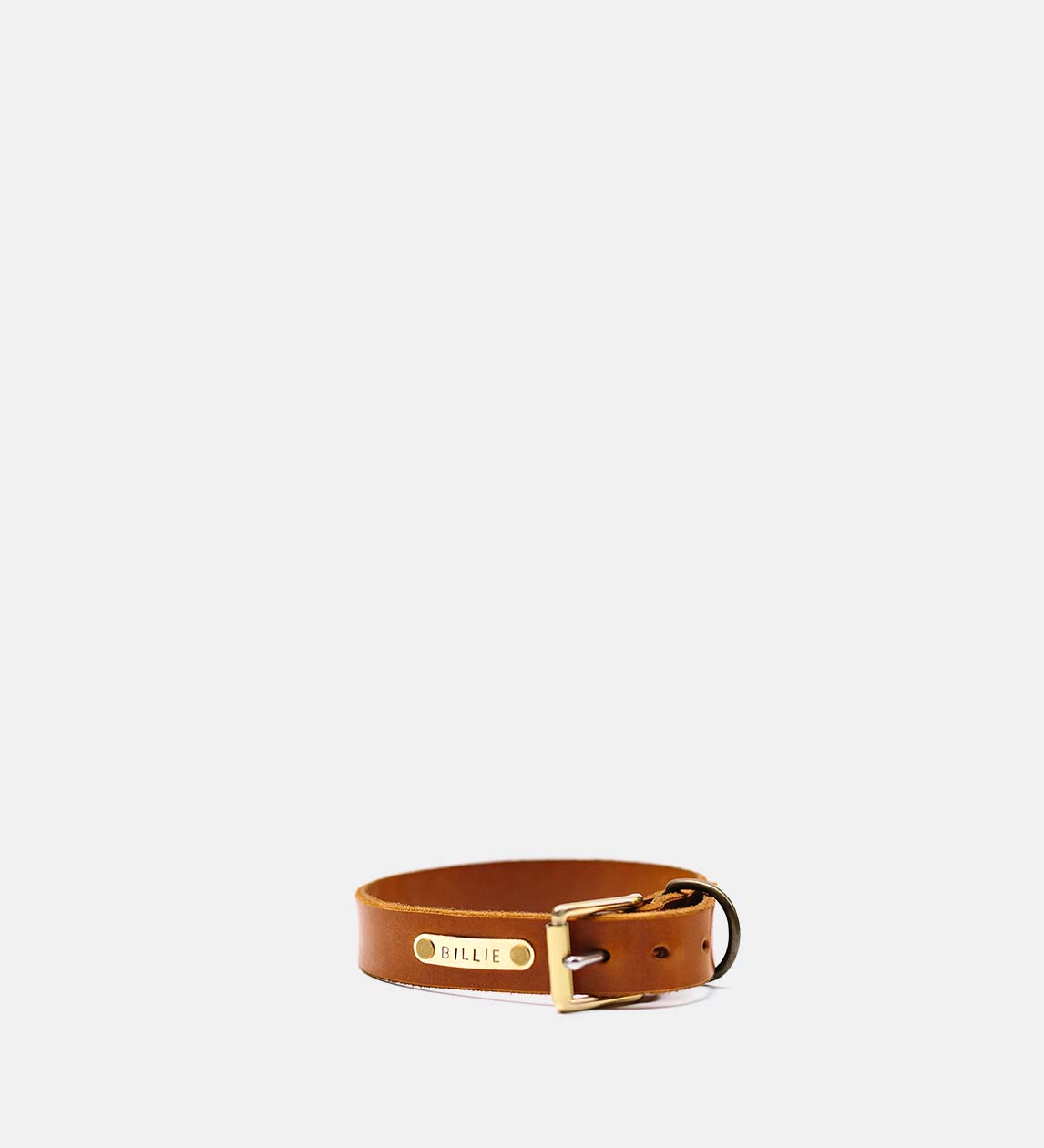 Leather dog collar with a full english brass roller and D buckle with personalised embossed brass plaque