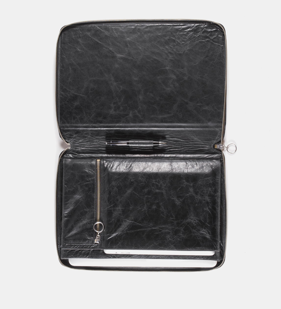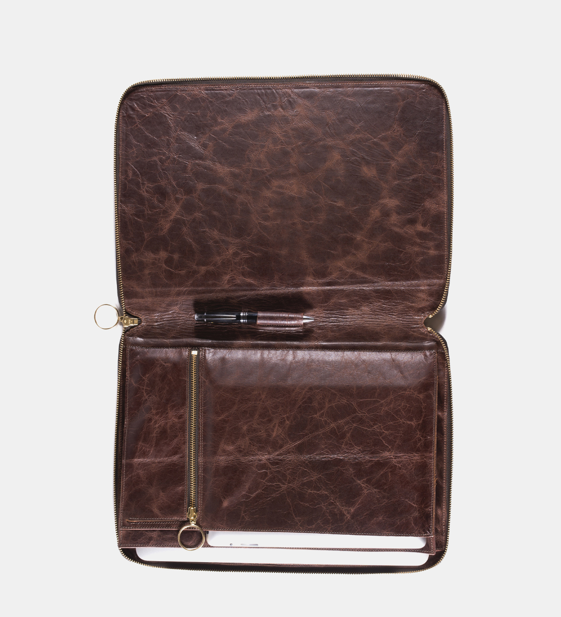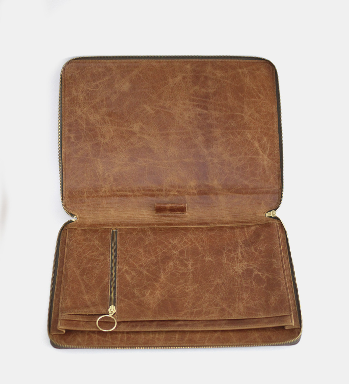 A leather compendium to hold A4 documents or devices with sleeves and zipped compartments for smaller materials. Closes with a zip.