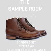 This sample product is for a Gordon Boot Heritage in a size 6.5 AU. It was made on the Cameron CAM E fitting last. It uses a local saddle tan leather upper handdyed to whisky and has a Mckay welted Starr outsole with a raw wax edge. RRP $1100. Made in 2024.